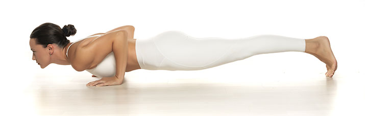 - On an exhale, lower chest toward floor, bending elbows back, arms close to body, abs tight. Hold a few inches above floor.
